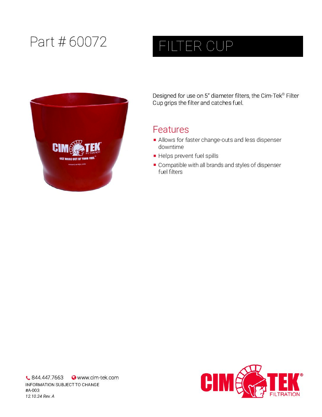 Designed for use on 5” diameter filters, the Cim-Tek® Filter Cup grips the filter and catches fuel.